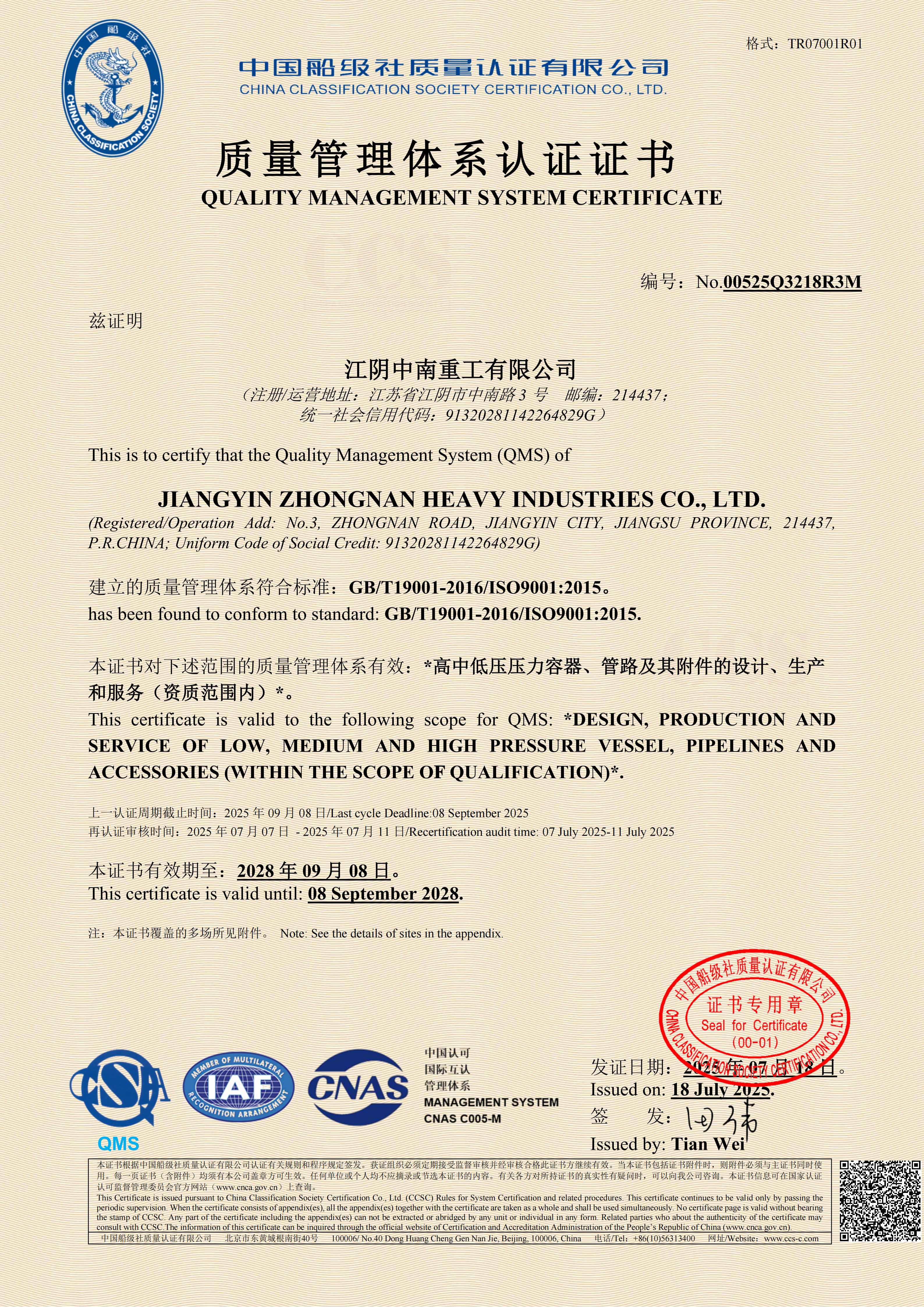 质量管理体系认证证书