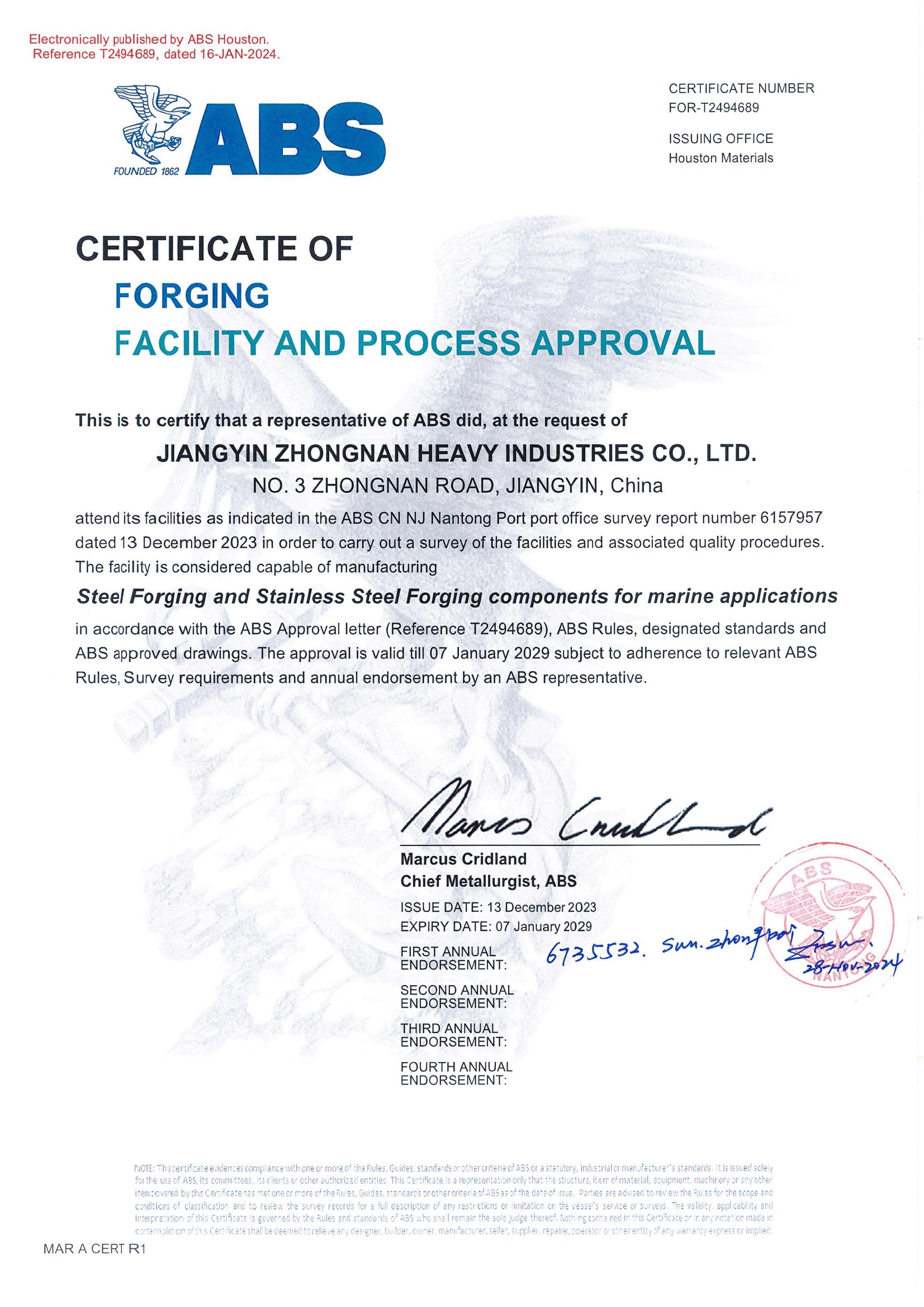 ABS-Forging Factory Approval Certificate