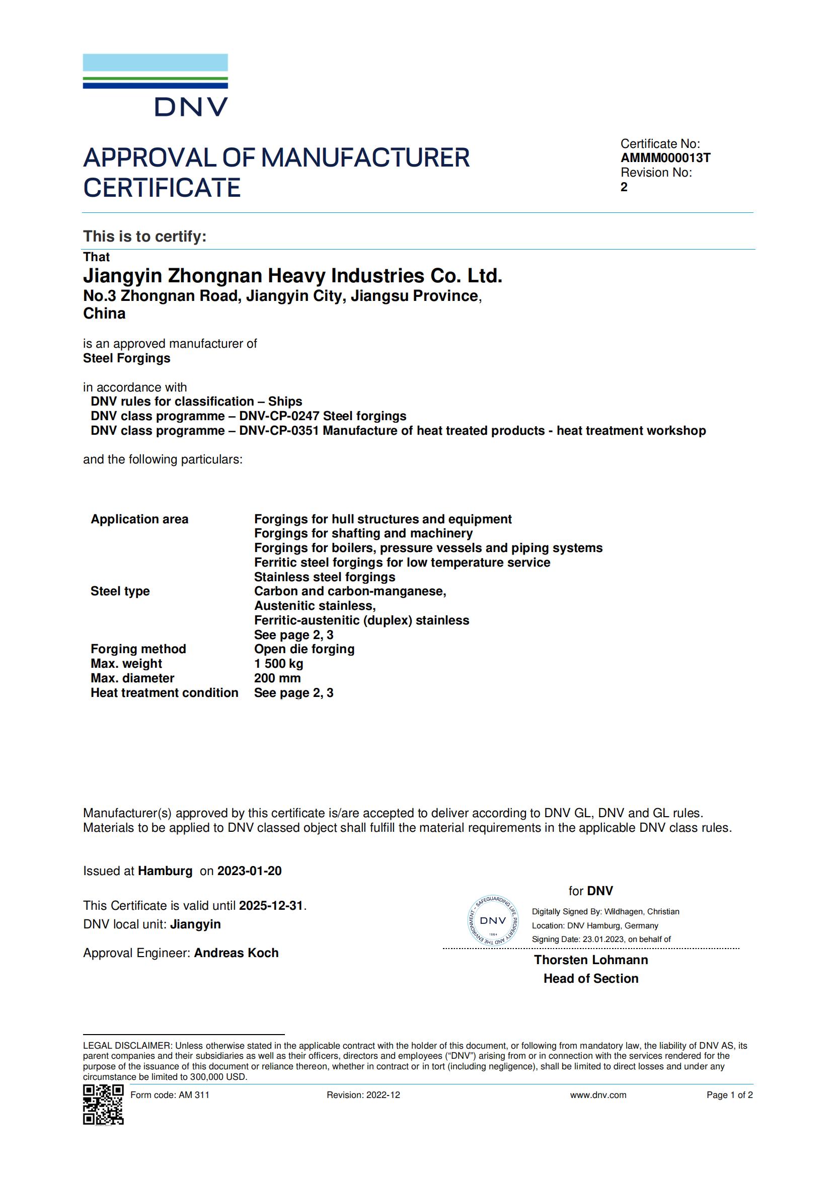 DNV-Forging Factory Accreditation Certificate