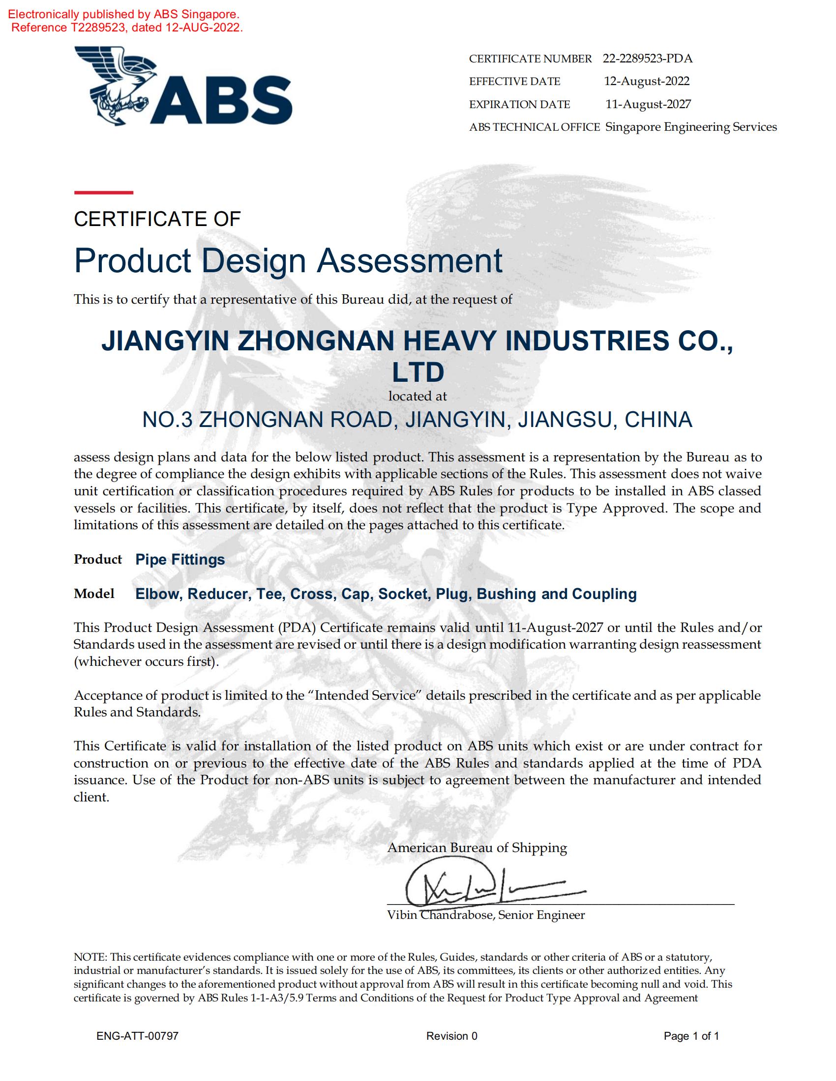 ABS-PDA Flange Approval Certificate